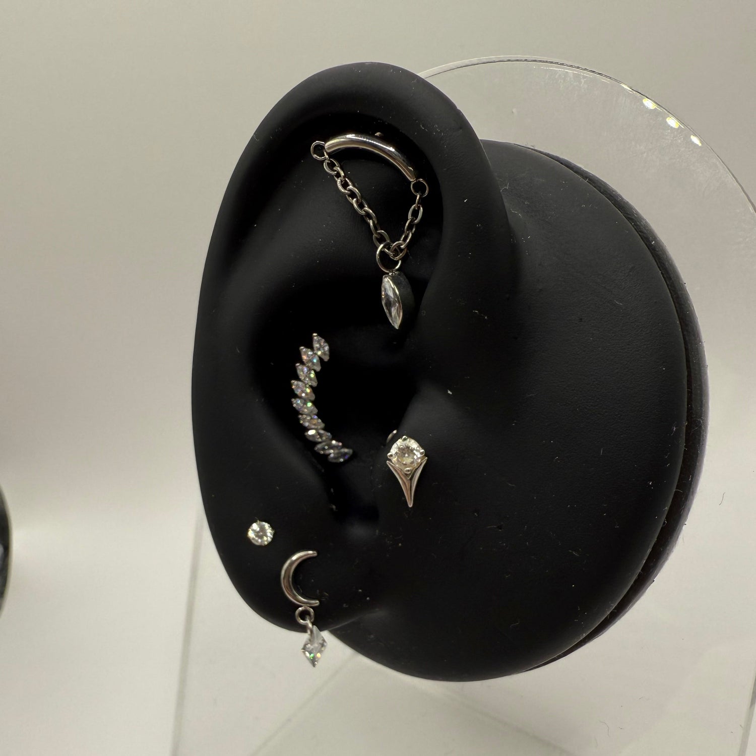 - Chained Accents: Curved barbell or hoop with chain and gemstone details, ideal for a modern helix ear stack.